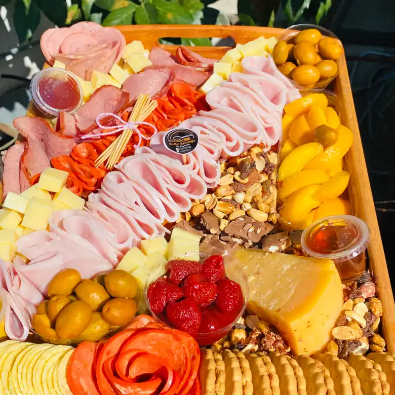 Contiene : jamón ,queso gouda ,chorizo ,frutas ,aceitunas ,salsas acompañantes ,Pringles o galletas dulces y frutos secos