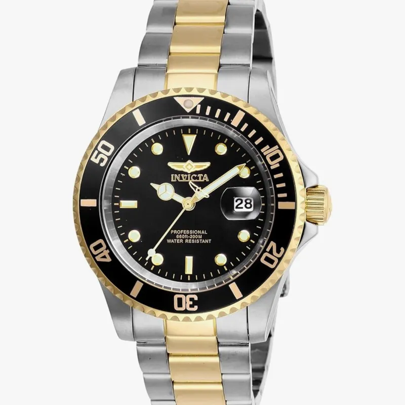 Modelo: 26973 Caja de acero inoxidable de 1.575 in de diámetro x 0.492 in de grosor; esfera negra; ventana de fecha ampliada; manecillas luminosas y marcadores de hora Movimiento de cuarzo japonés, calibre PC32; ensamblado en Japón; batería SR626SW incluida; Peso del reloj: 4.94 oz Correa de acero inoxidable en tono dorado y acero, 7.087 in de largo x 0.787 in de ancho; la correa es ajustable añadiendo o quitando eslabones; cierre de seguridad plegable Cristal de fusión de llama; Corona de empuje/tracción; Bisel unidireccional de acero inoxidable con anillo bisel superior negro; Resistente al agua de 656.2 ft: Adecuado para actividades marinas profesionales y deportes acuáticos superficiales. Adecuado para buceo. Diámetro del estuche 40 Milímetros Ancho de banda 20 Milímetros Grosor del estuche 12,5 Milímetros Largo de la banda 180 Milímetros Peso del artículo 250 Gramos Descripción del rango de edad Adulto