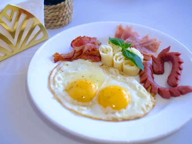 2 huevos al gusto, queso gouda, jamón, bacon, salchichas y rebanadas de pan.