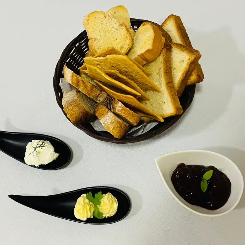 Rebanadas de pan, confitura de fruta y mantequilla.