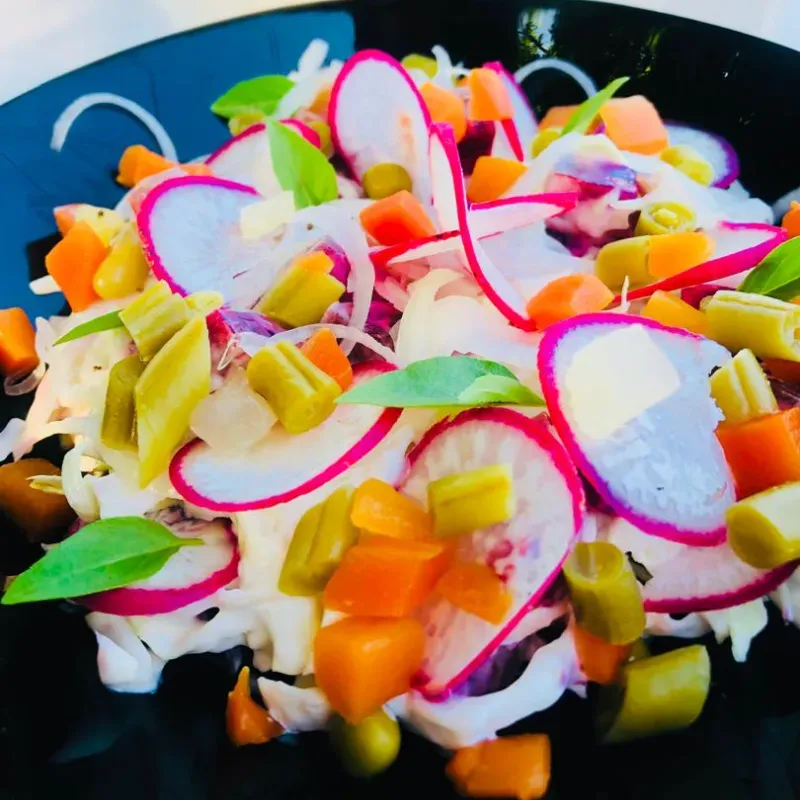 Col, remolacha, macedonia de vegetales, cebolla, rábano y salsa mayonesa