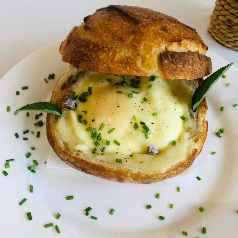 Concha de las rústico con jamón y una perla de huevos fritos