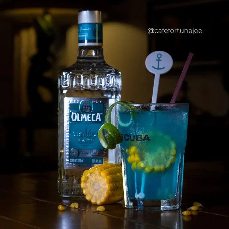 tequila blanco, curacao azul y agua gaseada