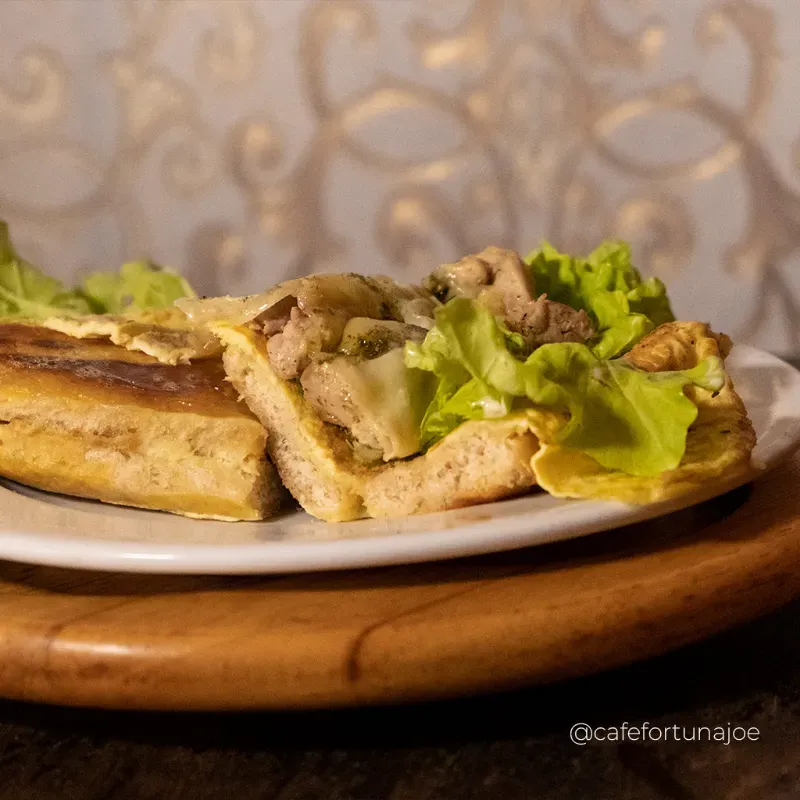 pan, tortilla, pollo al pesto, queso, cebolla y mayonesa