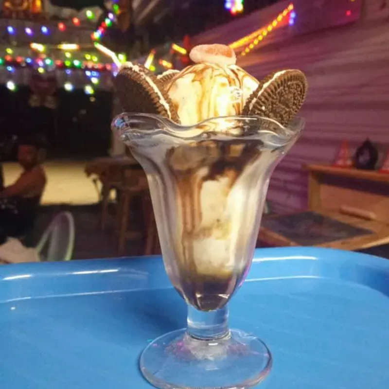 Una Copa de Helado con 4 Galleticas Encima, Cereales y Leche Condensada.