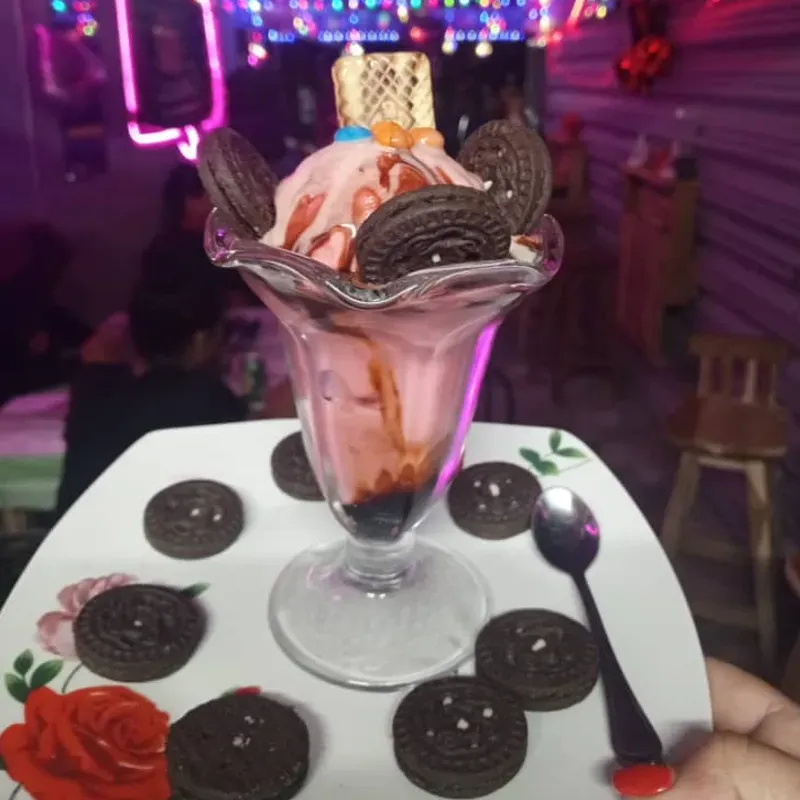 6 Galletas Alrededor de la Copa, con 3 Bolas de Helado, Cereales, Galletas y Leche Condensada.