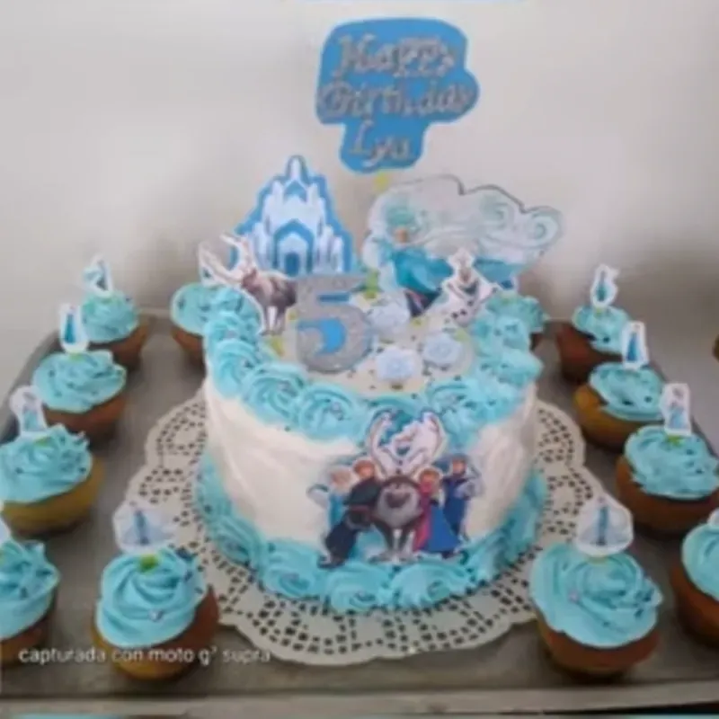 Cake 20×8 cm temática en cartulina con doble relleno, acompañado de 20 cupcakes decorados.