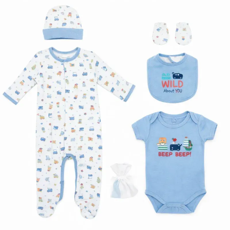 Conjunto Azul y Blanco con Body, Gorro, Babero y Accesorios de Vehículos para Bebé