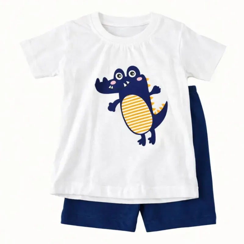 Conjunto Blanco y Azul Marino con Camiseta Dinosaurio y Short para Bebé