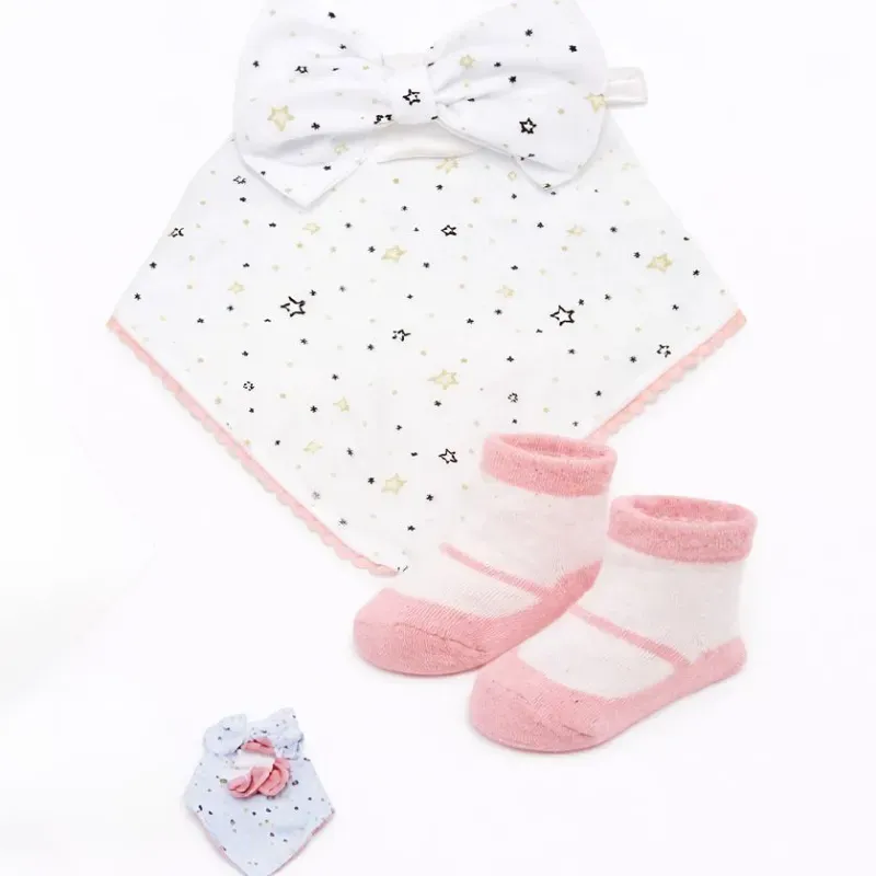 Conjunto Blanco y Rosa con Babero y Calcetines de Estrella para Bebé
