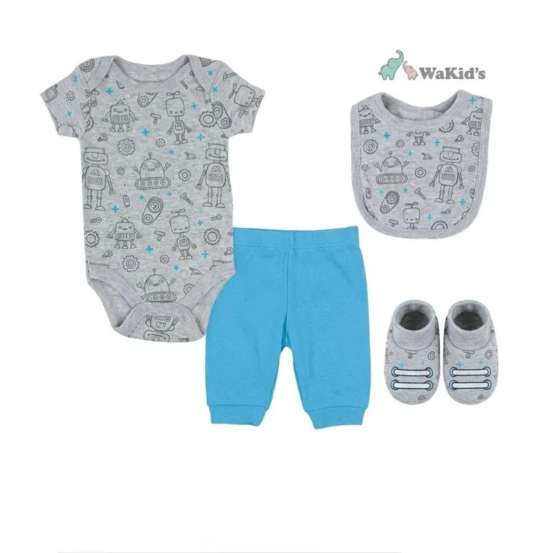 Conjunto de Body, Pantalón, Babero y Botitas para Bebé Temática Robots