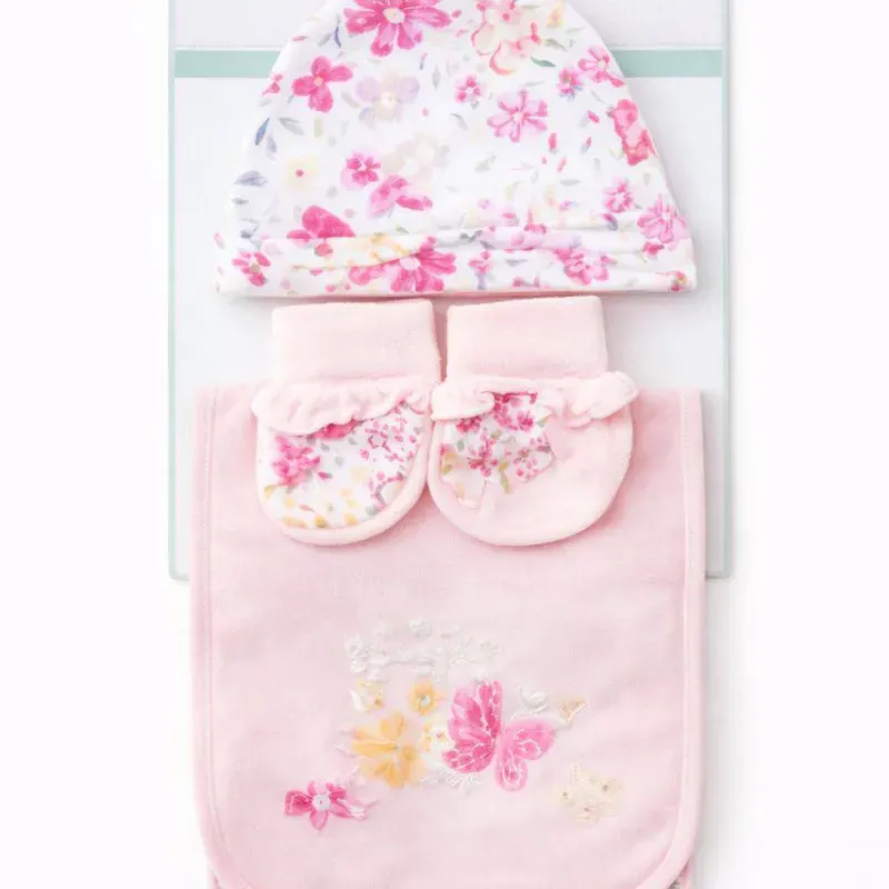 Conjunto Floral Rosa con Gorro, Medias y Babero para Bebé