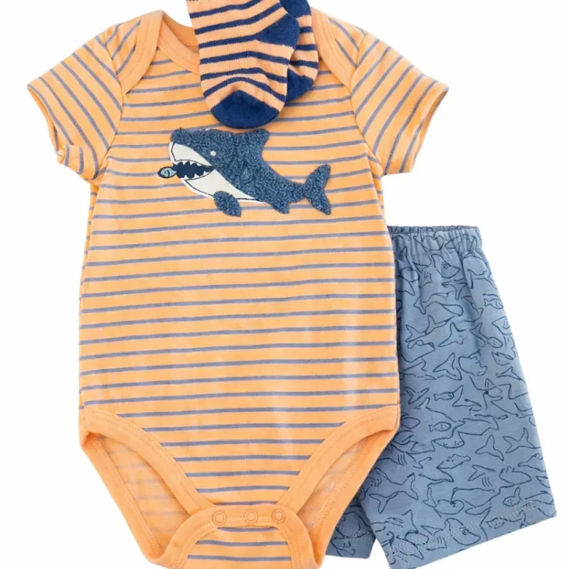 Conjunto Naranja y Azul con Body, Short y Medias de Tiburón para Bebé