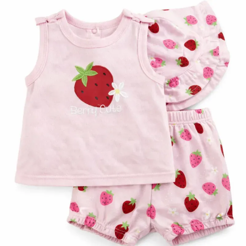 Conjunto Rosa y Blanco con Top de Fresa, Short y Cubrepañal para Bebé