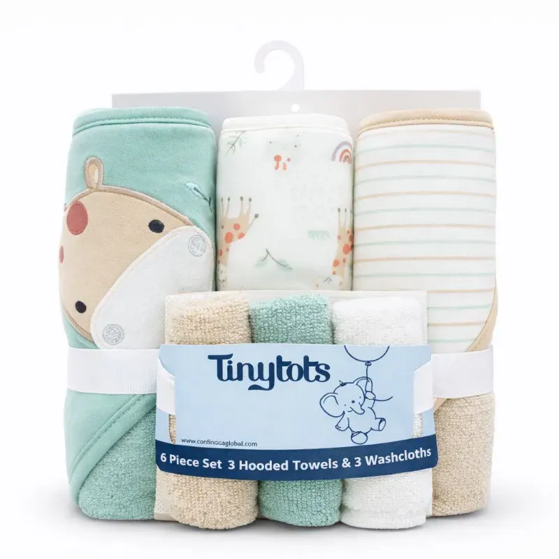 Set de Toallas con Capucha y Paños Animalitos Verde y Beige para Bebé