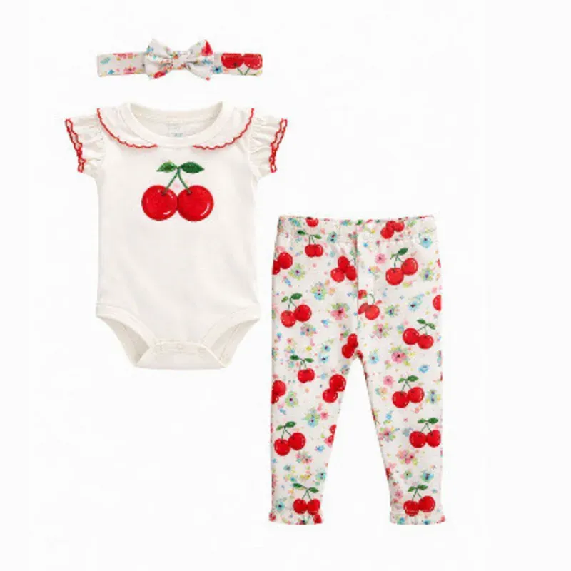 Conjunto Blanco y Rojo con Body, Bloomers y Cinta de Cerezas para Bebé