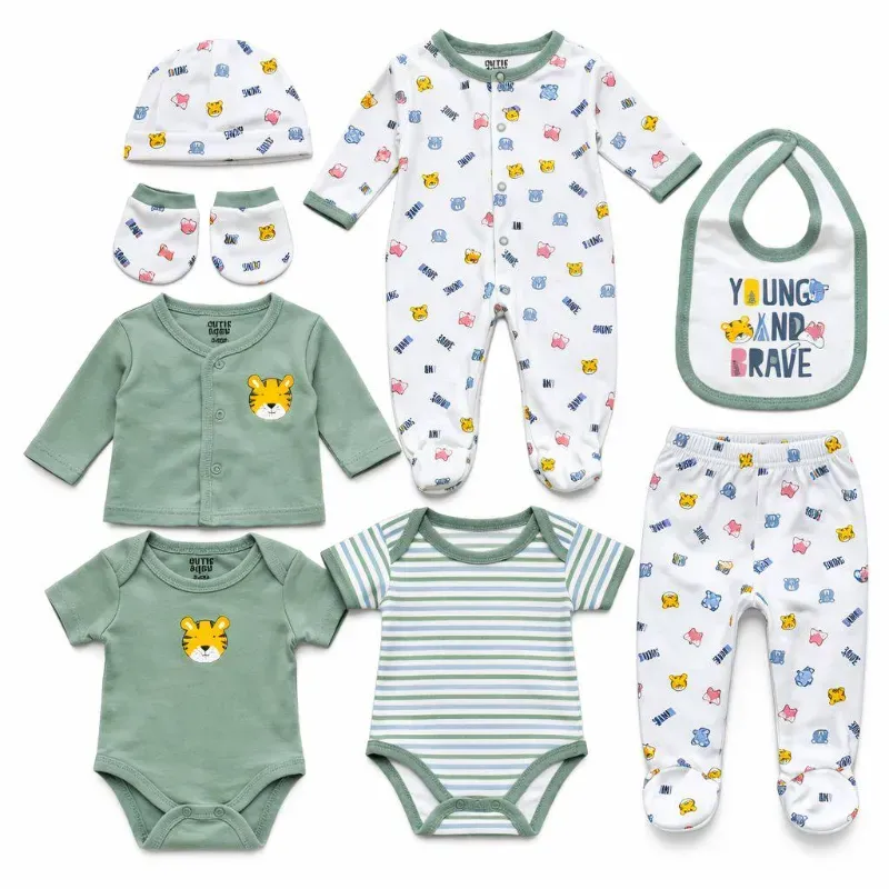 Conjunto Blanco y Verde de Animales con Abrigo, Bodys, Enterizo, Pantalón y Accesorios para Bebé