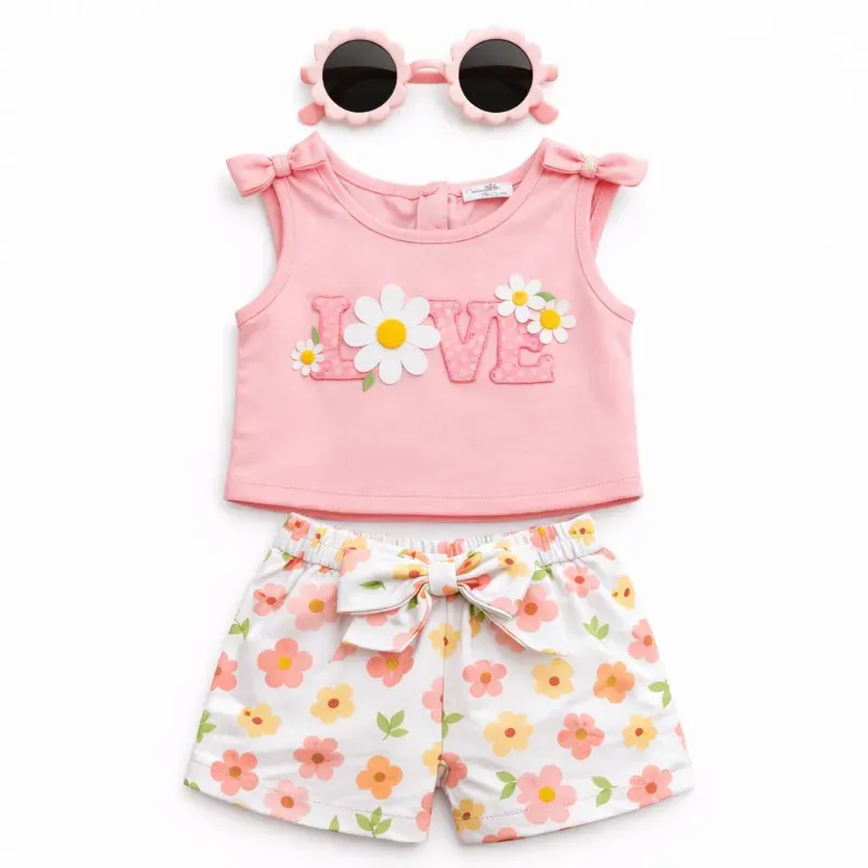 Conjunto Durazno y Blanco con Top, Short de Flores y Gafas