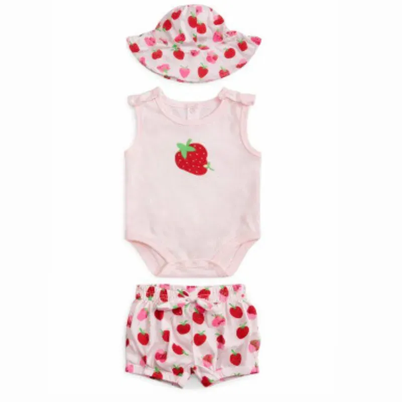 Conjunto Rosa y Blanco con Top de Fresa, Short y Cubrepañal para Bebé