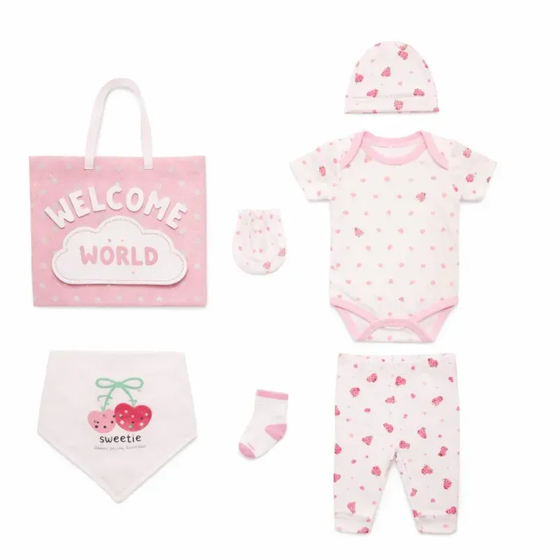 Set Blanco y Rosa con Body, Pantalón, Gorro y Calcetines para Bebé