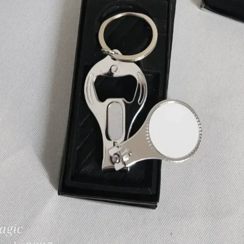 Llavero acero inoxidable 4 en 1, incluye corta uñas, lima de uñas, abridor de botellas y llavero. Se entrega con caja decorada.