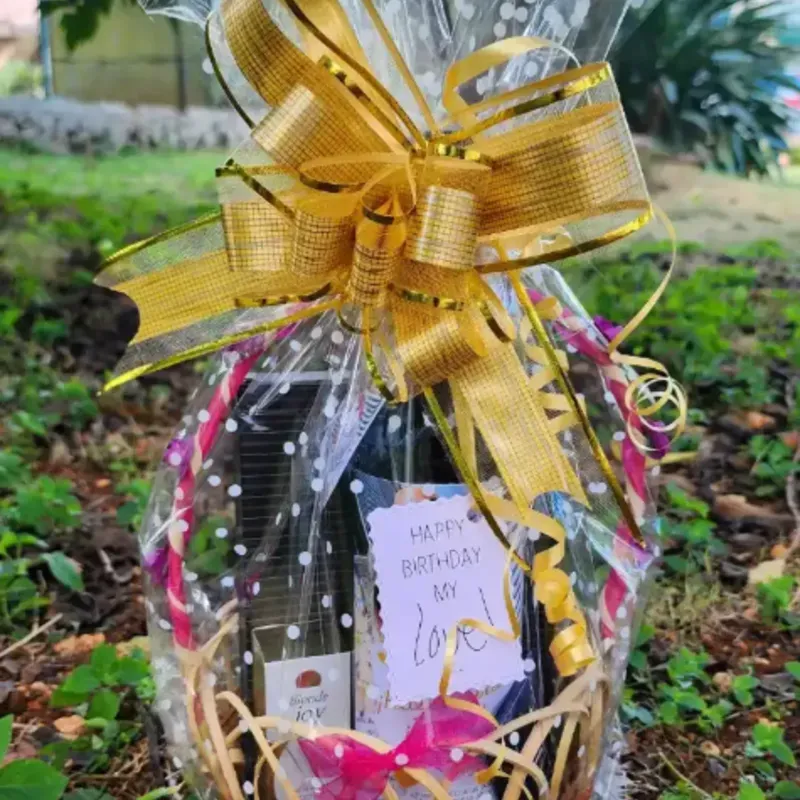 Cesta o caja decorada, 1 botella de vino personalizada, 4 refrescos o maltas( segun disponibilidad), 2 pullovers blanco diseño de pareja,chuches, 1 perfume pequeño.