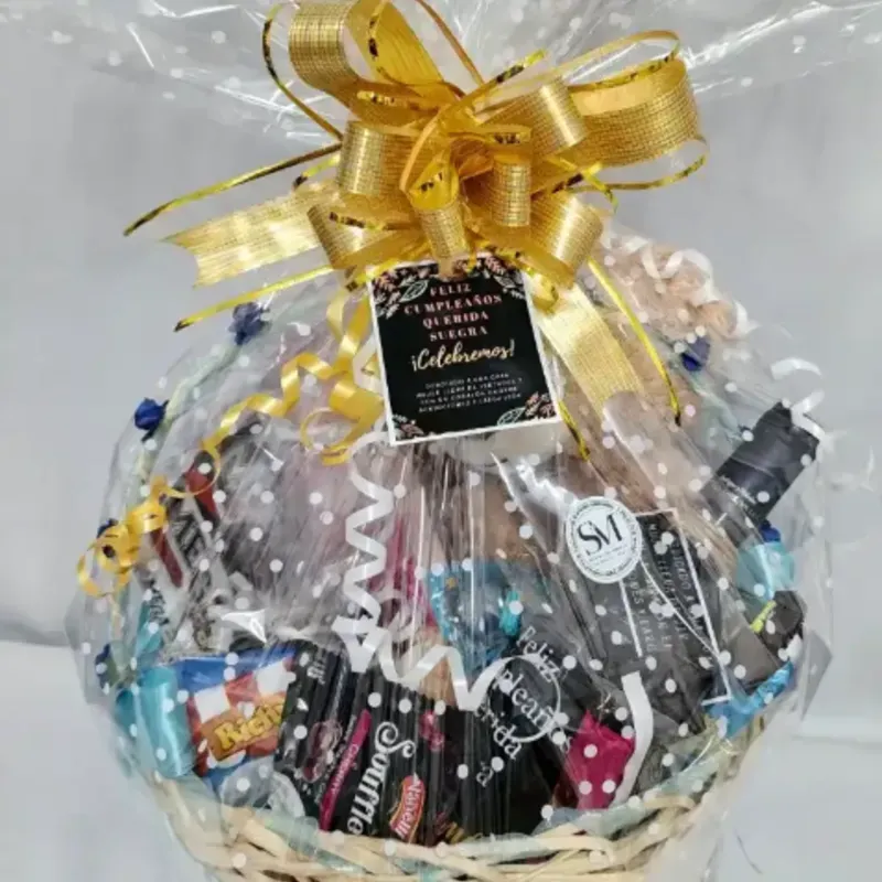 Cesta grande decorada , peluche 30 cm, chuches, botella de vino personalizada, jarra personalizada, cristal mediano, 4 malta, 1 juego de shampoo y suavisador, 1 perfume pequeño.