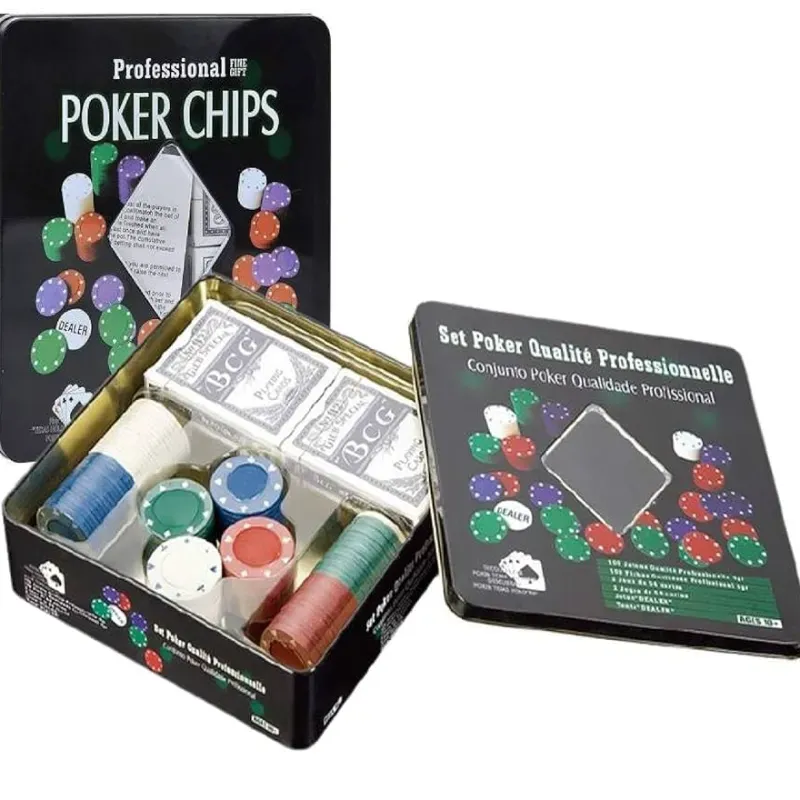Caja metálica 4G, chip 100 fichas + 2 juegos de barajas y una ficha de dealer.