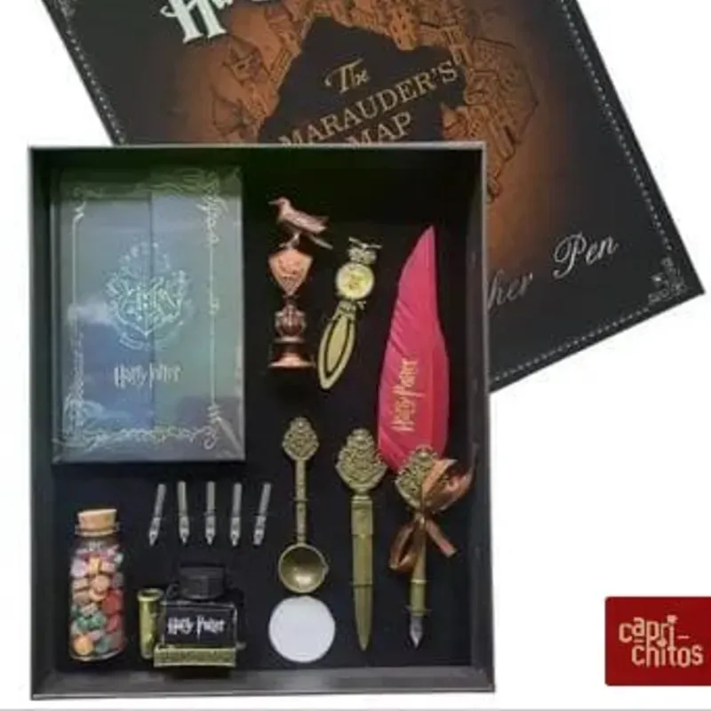 - Contiene en una base acolchonada con una agenda, un cuño metálico de la casa, un tintero, un posatintero, una espada metálica de adorno, una cuchara para derretir la cera de colores, tinta funcional y una vela blanca.