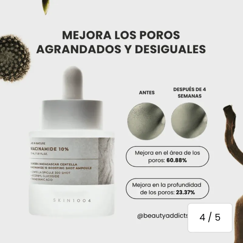 🌸Ampolla iluminadora de Skin1004 con 10 % de niacinamida, ácido tranexámico y centella asiática de Madagascar, que refina los poros, mejora la textura y unifica el tono, fortaleciendo la barrera cutánea con una absorción potenciada por microespículas.