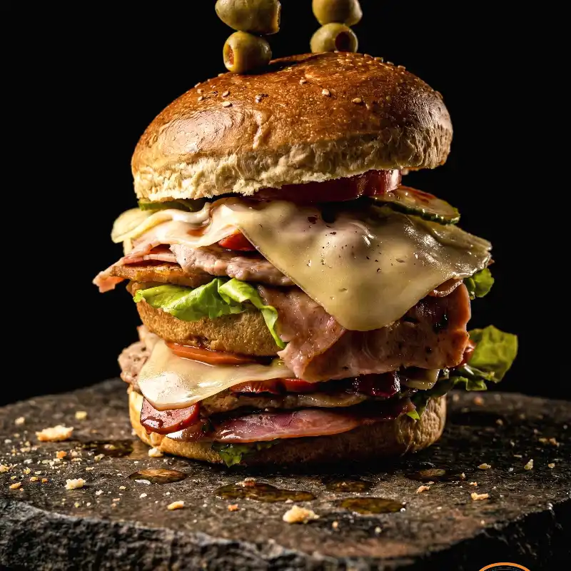 Nuestra Mega Hamburguesa te propone un verdadero reto podras con ella ( Jam贸n Viking, Jam贸n Pierna, 2 Hamburguesa plus de 100g, 2 Quesos Goudas , 4 Salchichas , 2 Panes , Vegetales , Mayonesa y Aderezos) listo ??