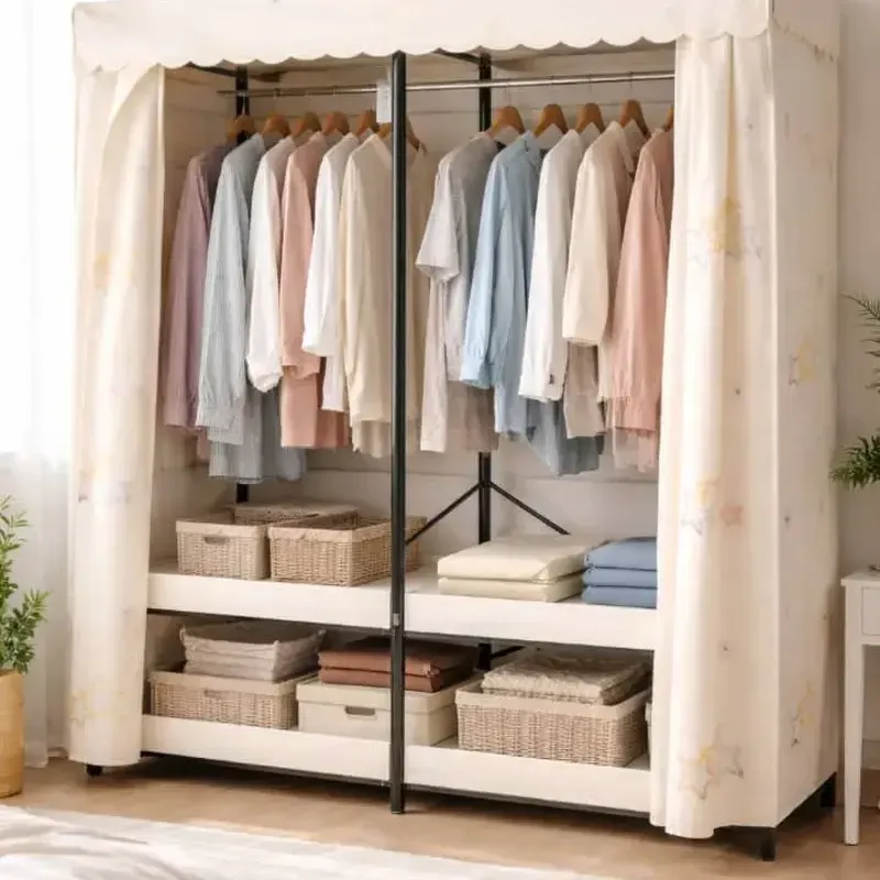 Armario práctico y espacioso, ideal para organizar ropa, zapatos y accesorios de forma eficiente. Su diseño moderno con cubierta de tela protege el contenido del polvo y aporta un toque elegante al dormitorio.