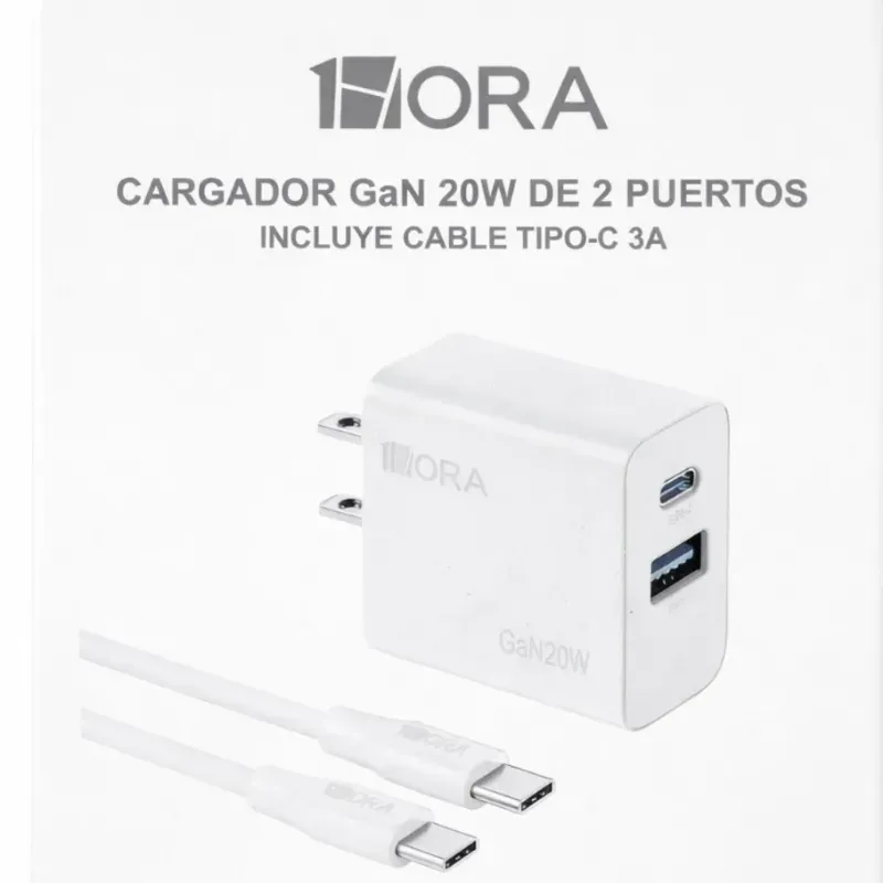 Cargador tipo C marca 1 Hora. 20 W. Carga rápida. El combo incluye el cable y el transformador.