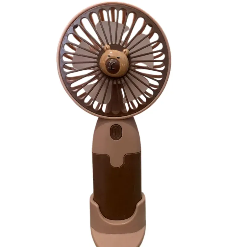 Mini ventilador de mano. Recargable. Trae una base que se quita y se pone para adaptarlo a diversos contextos. La carga dura más de una hora.