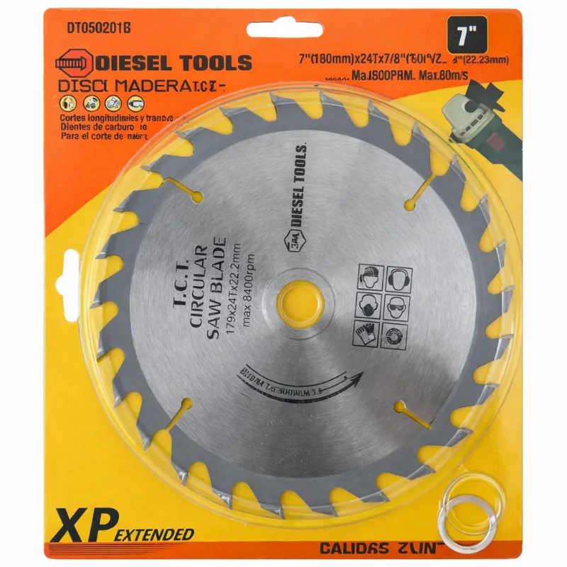 Disco circular Diesel Tools para corte de madera, fabricado con dientes de carburo de tungsteno (T.C.T.), que garantizan cortes limpios, precisos y de mayor durabilidad. Ideal para cortes longitudinales y transversales en madera y derivados.
