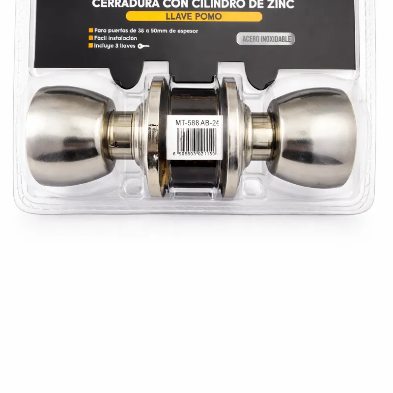 Cerradura para puerta tipo perilla fabricada en metal resistente con acabado satinado, diseñada para brindar seguridad y durabilidad. Compatible con puertas de diferentes espesores, cuenta con sistema anti-pick y protección contra forzado. Ideal para puertas interiores y exteriores en hogares, oficinas o locales. Fácil de instalar, confiable y de larga vida útil.