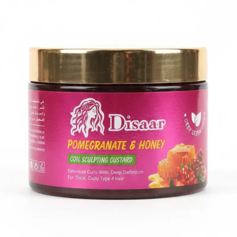 "Coil Sculpting Custard" (natilla o crema para esculpir rizos) de la marca Disaar, específicamente de su línea de Granada y Miel (Pomegranate & Honey). Aquí te detallo para qué sirve y sus características principales: ¿Para qué sirve? Es un producto de peinado diseñado para definir y dar forma a los rizos. Su función principal es: Definición profunda: Ayuda a que el patrón del rizo se mantenga agrupado y sin frizz. Fijación: Proporciona una estructura que ayuda a que el peinado dure más tiempo. Hidratación: Al contener ingredientes como granada y miel, busca mantener la humedad dentro del cabello para que no se vea seco o quebradizo. Tipo de cabello ideal Según la etiqueta, está formulado especialmente para: Cabello tipo 4 (Afro): Cabellos con texturas muy cerradas y densas que necesitan productos con mayor capacidad de moldeado. Cabello grueso: Personas con mucha hebra capilar que requieren control. Cómo se usa normalmente Se aplica sobre el cabello limpio y húmedo, dividiéndolo por secciones. Se distribuye el producto desde la raíz hasta las puntas para definir el rizo y luego se deja secar al aire o con un difusor. Para aprovechar al máximo este tipo de Custard, la clave está en la técnica y en cómo lo capas con otros productos. Aquí te doy una guía rápida para obtener los mejores resultados: Cómo combinarlo (Técnica LOC/LCO) Este producto funciona mejor como el paso final de una rutina para sellar la hidratación: Leave-in (Crema de peinado ligera): Primero aplica una base hidratante. Esto asegura que el cabello esté suave antes de aplicar la fijación del custard. Aceite (Opcional): Si tu cabello es muy seco, una pequeña capa de aceite ayuda a retener la humedad. El Custard de Disaar: Aplícalo al final para "congelar" el rizo en su lugar y evitar que aparezca el frizz mientras se seca. Tips de Aplicación para un acabado profesional: Cabello muy mojado: Aplica el producto mientras el cabello aún gotea. Esto ayuda a que el custard se distribuya uniformemente y no deje residuos blancos. Secciones pequeñas: No lo apliques en toda la cabeza a la vez. Ve sección por sección usando tus dedos como peine (técnica de Raking) o definiendo rizo por rizo. No tocar mientras seca: Una vez aplicado, evita tocar el cabello hasta que esté 100% seco. Si lo tocas antes, romperás la fijación y generarás frizz. Romper la "casta" (dureza): Si al secarse notas el cabello un poco rígido o "tieso", aplica unas gotas de aceite en tus manos y aprieta suavemente el cabello (haciendo scrunch) para suavizarlo sin perder la definición. Análisis de Ingredientes y Método Curly Aunque la lista exacta puede variar según el lote, los productos de "Granada y Miel" de este tipo suelen enfocarse en ser más naturales. Pomegranate (Granada): Es un antioxidante potente que fortalece el folículo. Honey (Miel): Es un humectante natural (atrae el agua al cabello) y aporta un brillo increíble.