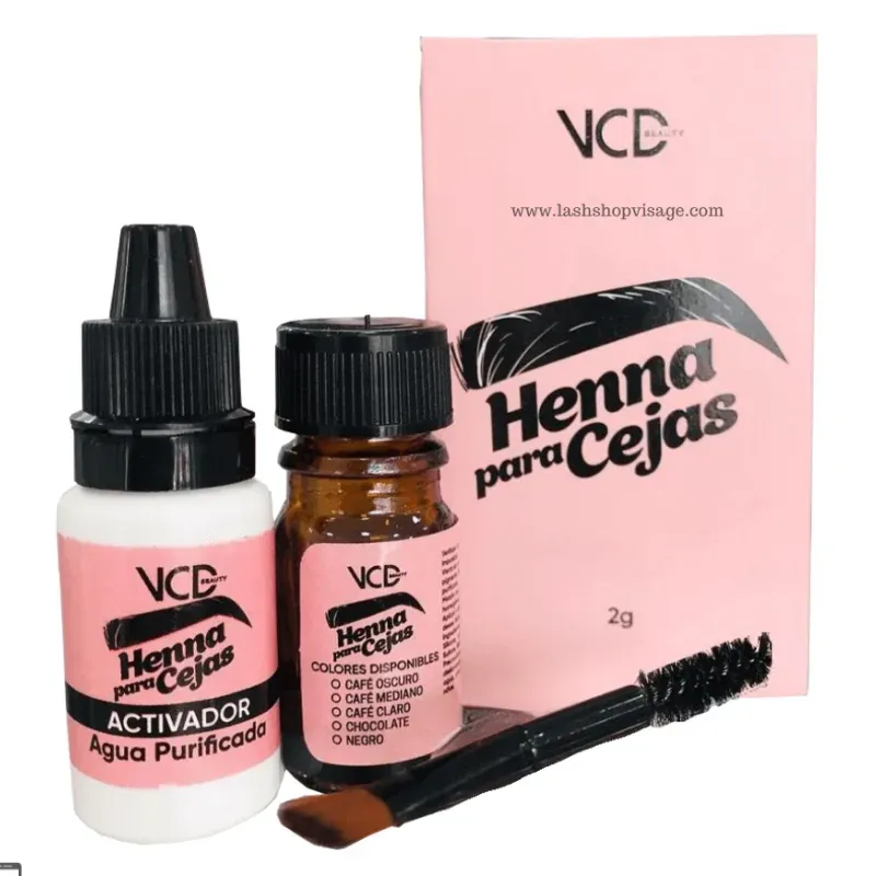 Kit de Henna para Cejas de la marca VCD Beauty. Es un tratamiento cosmético diseñado para teñir tanto el vello de la ceja como la piel debajo de este, ayudando a definir la forma, dar apariencia de mayor volumen y cubrir espacios vacíos.