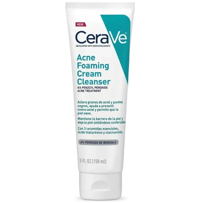 CeraVe Acne Foaming Cream Cleanser, un limpiador facial diseñado específicamente para tratar el acné y los puntos negros mientras cuida la barrera de la piel.