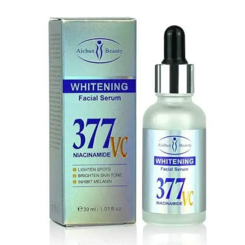377 VC Niacinamide Whitening Facial Serum. Es un suero cosmético diseñado principalmente para mejorar la apariencia de la piel en cuanto a tono y manchas. Aquí te detallo qué es y para qué sirve: ¿Qué es? Es un concentrado líquido (serum) que combina tres ingredientes clave en la cosmética actual: 377 (Phenylethyl Resorcinol): Un potente agente blanqueador conocido por ayudar a reducir la pigmentación. Vitamin C (VC): Un antioxidante que aporta luminosidad y protege contra el daño ambiental. Niacinamida: Una forma de Vitamina B3 que ayuda a calmar la piel, cerrar poros y mejorar la barrera cutánea. ¿Para qué sirve? Según el empaque y sus ingredientes, sus funciones principales son: Aclarar manchas: Ayuda a desvanecer manchas oscuras causadas por el sol, la edad o cicatrices de acné. Unificar el tono: Reduce las rojeces y las zonas amarillentas, dando un aspecto más uniforme al rostro. Aportar luminosidad: Combate el aspecto de "piel cansada" o mate. Inhibir la melanina: Ayuda a prevenir la formación de nuevas manchas oscuras. ⚠️ Recomendaciones importantes Como este producto contiene ingredientes activos (especialmente Vitamina C y 377), ten en cuenta lo siguiente: Uso de Bloqueador Solar: Es obligatorio usar protector solar durante el día si aplicas este suero, ya que estos ingredientes pueden vo