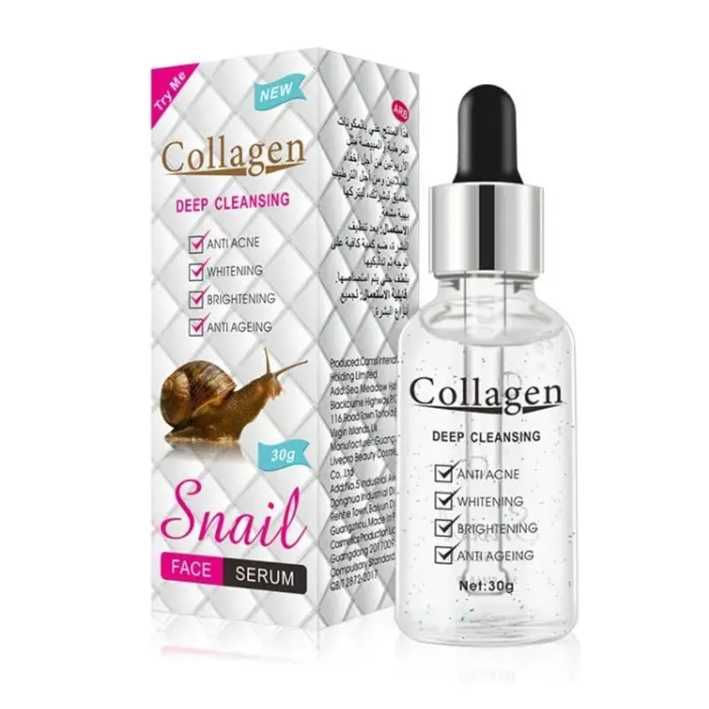 Sérum Facial de Caracol y Colágeno (Snail Collagen Face Serum). Es un tratamiento concentrado diseñado para mejorar la textura de la piel, hidratar y combatir signos de la edad.