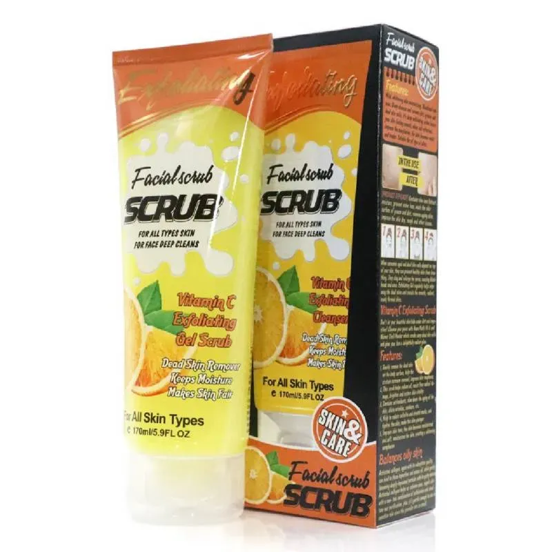 Exfoliante Facial en Gel con Vitamina C de la marca Skin & Care. A diferencia de los exfoliantes con granos gruesos, este parece ser un "peeling" tipo gel que ayuda a retirar células muertas y limpiar los poros de forma profunda.