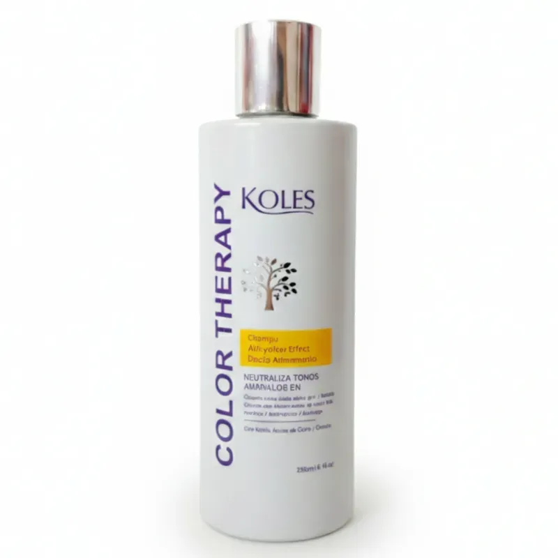 Shampú matizador (comúnmente llamado "champú morado" o "blue shampoo") de la línea Color Therapy de KOLES.