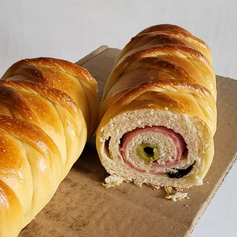 Delicioso pan de mantequilla al mejor estilo venezolano. Está relleno de jamón, pasas y aceitunas.