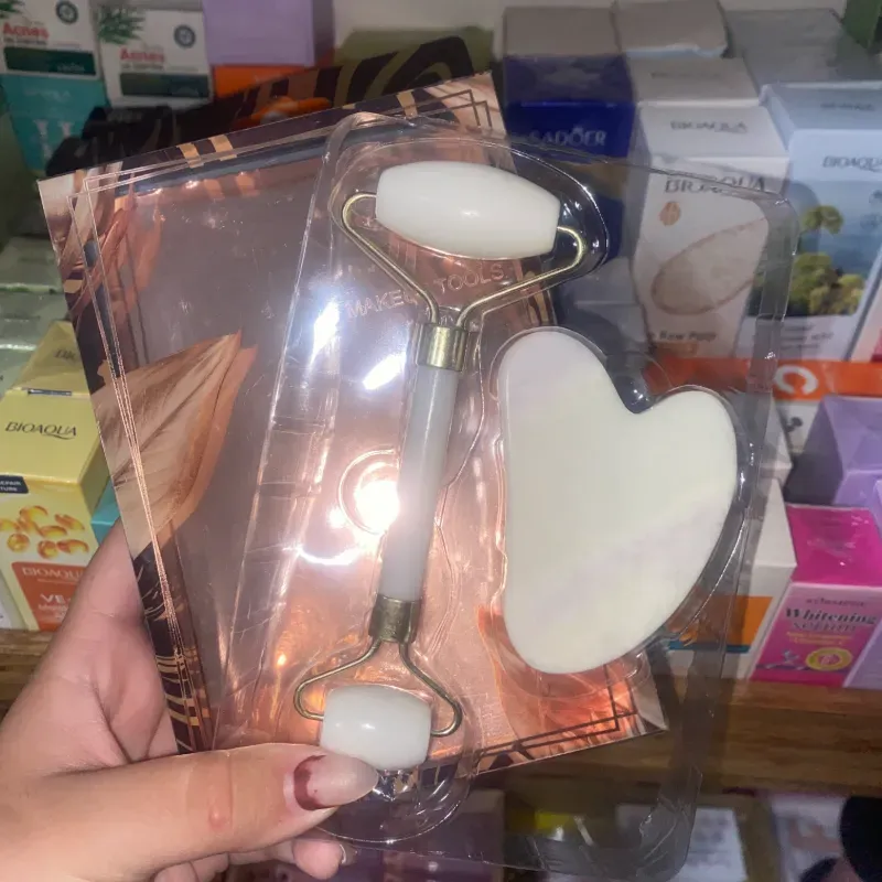 Set de Rodillo de Jade y piedra Gua Sha ideal para masajear el rostro