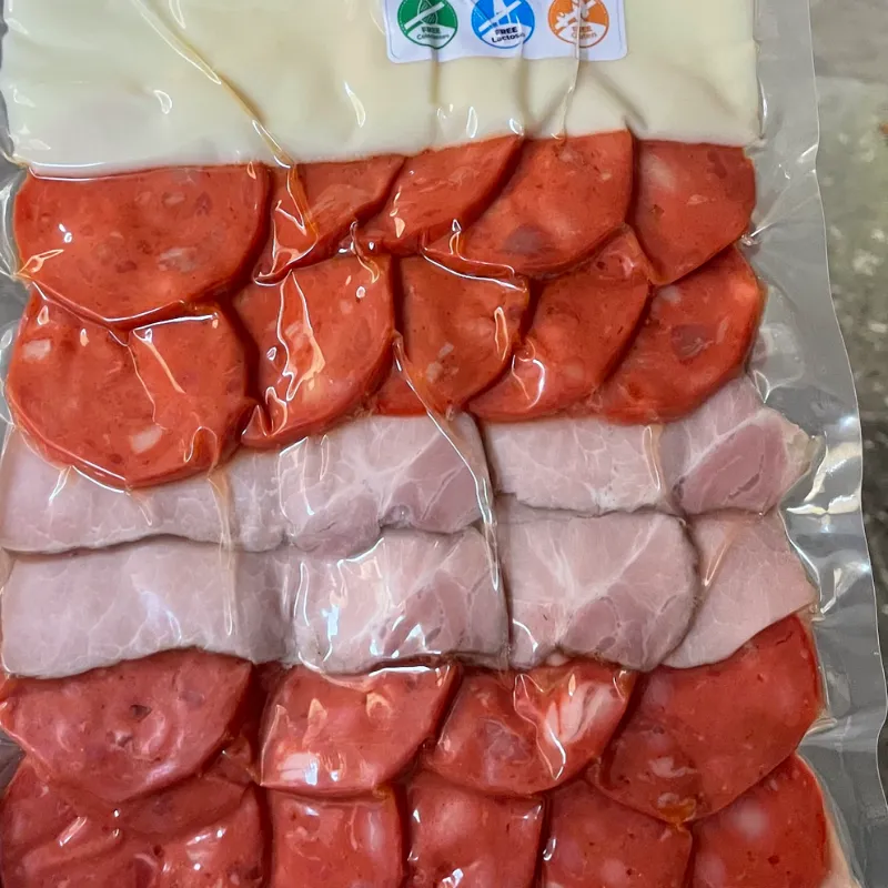 Chorizo vela , Peperoni ,Lomo cocido, Masa de Cerdo Ahumada,Jamón Visking relleno con Aceitunas y Queso .