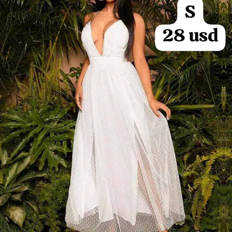 Vestido blanco con escote, espalda afuera y apertura en las piernas