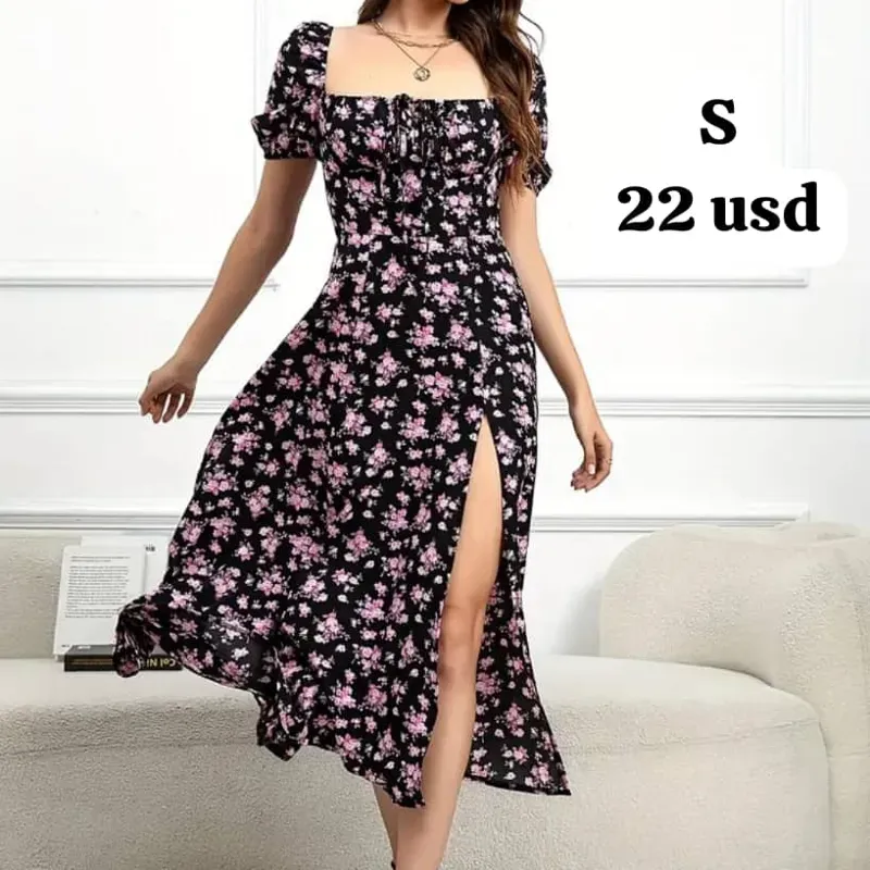 Vestido casual estampado con fondo negro y flores moradas