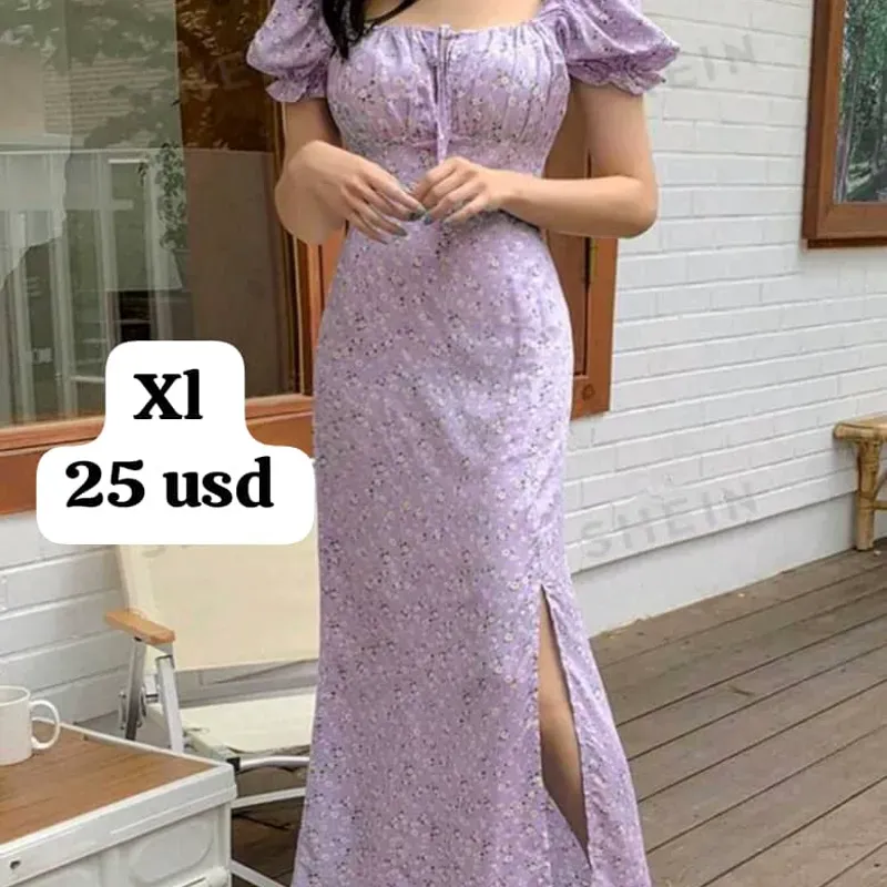 Vestido Lila largo abierto en una pierna con mangas de farol