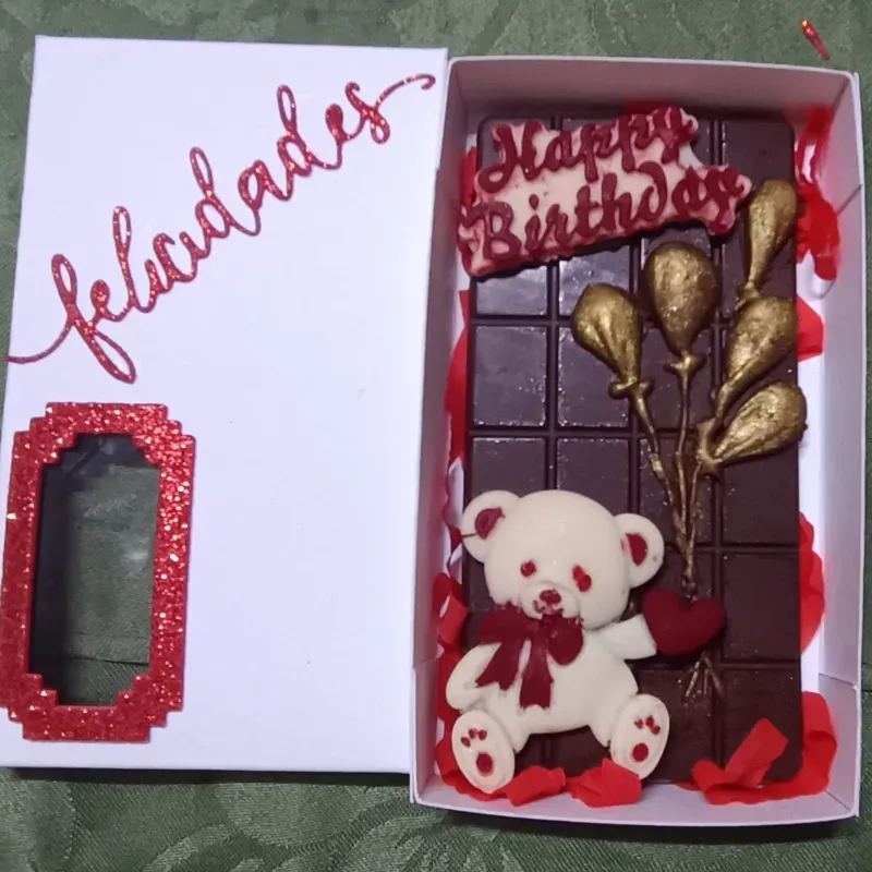 Tableta de chocolate semi amargo decorada con osito y globo de chocolate blanco